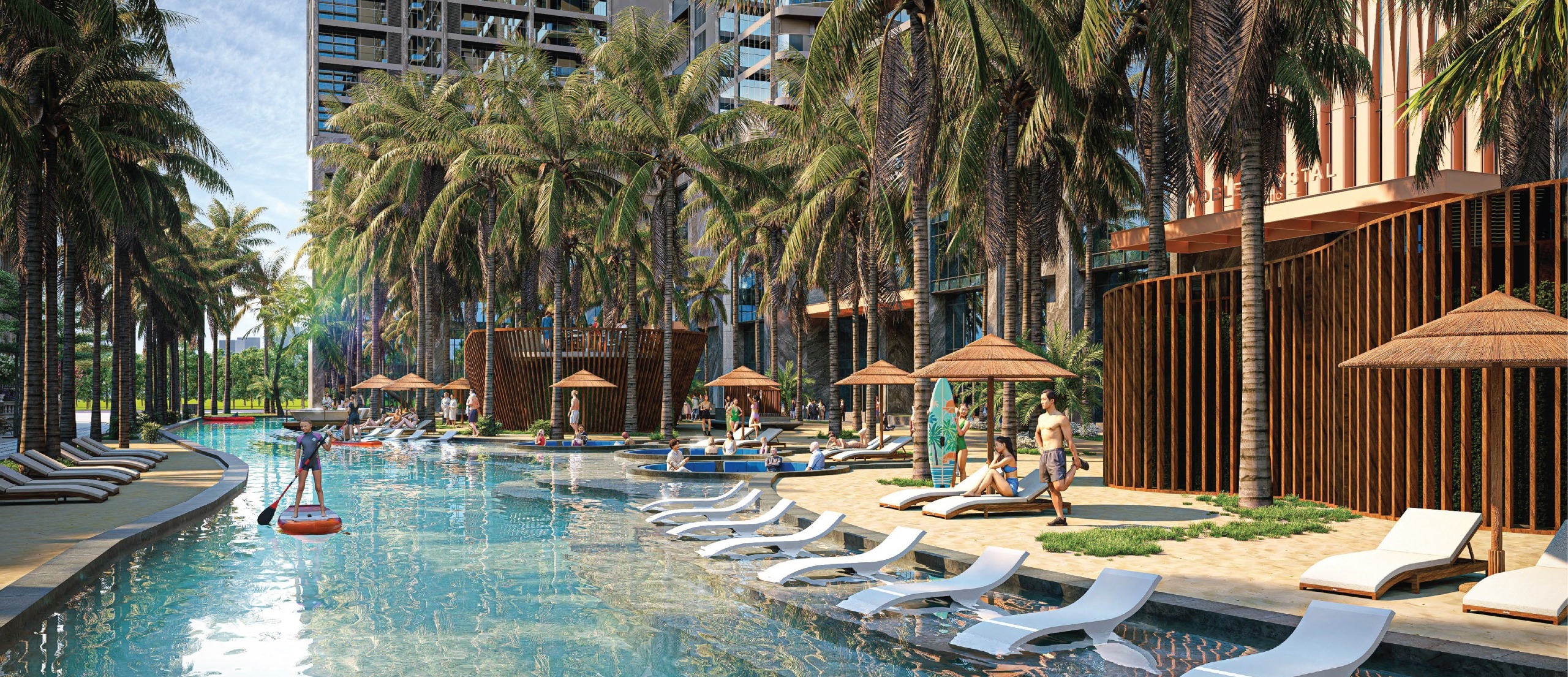 Chỉ vài bước thang máy, cư dân chạm tới không gian tiện ích mặt đất được quy hoạch như một khu nghỉ dưỡng thu nhỏ. Tổ hợp mặt nước rộng lớn, bãi cát trắng và hàng dừa xanh mang đến cảm giác như đang tận hưởng kỳ nghỉ biển giữa lòng thành phố. Người lớn thong thả dạo bộ trong vườn hoa bốn mùa, thư giãn bên quảng trường nước, trong khi trẻ nhỏ vui chơi an toàn tại khu vận động và hồ bơi riêng biệt.